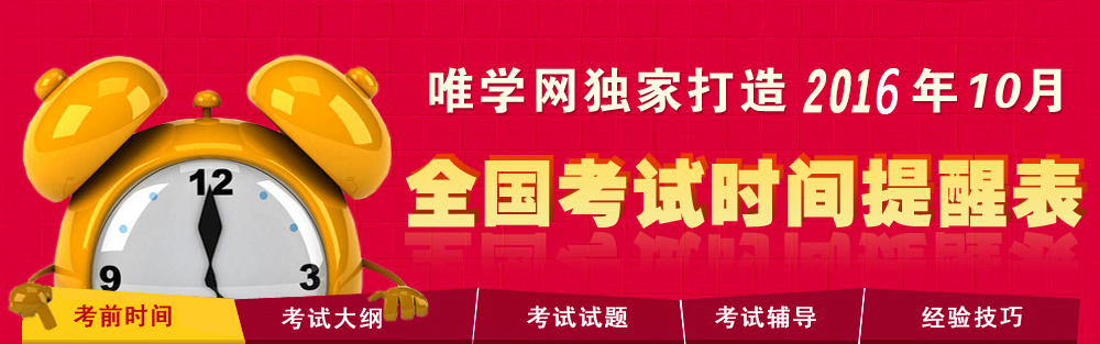 | 2016年10月29日-30日 | 成人高考 | * 注:唯學(xué)網(wǎng)提供的各項(xiàng)考試時(shí)間僅供參考,如與官方時(shí)間有出入,以官方考試時(shí)間為準(zhǔn),歡迎指正。 |